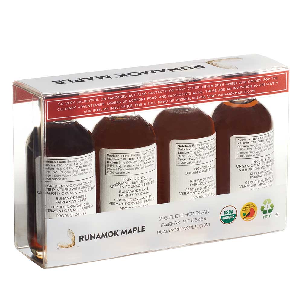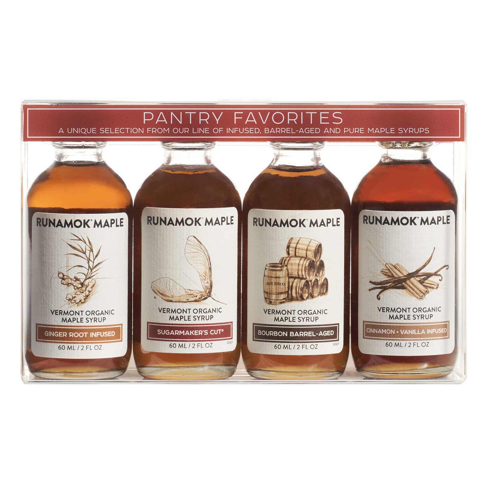Runamok Maple's Pantry Favorites Collection includes a bottle of Bourbon Barrel-Aged, Cinnamon + Vanilla Infused, Sugarmaker's Cut and Ginger Root Infused maple syrups. Made in Vermont, USA.